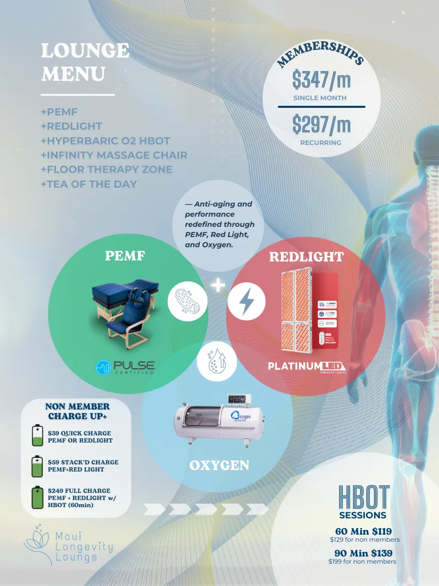 Members can book one red light and one PEMF session per day, plus receive discounted 60 min HBOT sessions at $129 (normally $169) & 90 min sessions are $159 (normally $199).